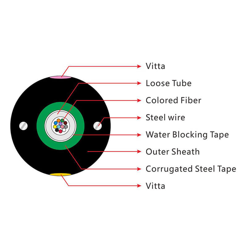 Les câbles blindés légers, les fibres monoforme/multimode sont placés dans un tube lâche en plastique à haut module.Le tube est enveloppé d'une couche de PSP longitudinalementEntre le PSP et le tube en vrac, un matériau hydrofuge est appliqué pour maintenir le câble compact et étanche. Deux fils d'acier parallèles sont placés des deux côtés du ruban d'acier.Le câble est complété par une gaine en polyéthylène (PE)..