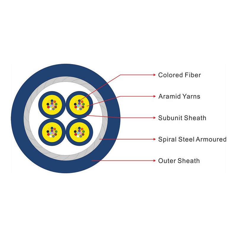 GJASFKV Le câble à fibre optique blindée multi-noyau intérieur est la fibre aramidée multi-fil renforcée d'une surface de fibre optique mini ф250μm à faisceau multi-noyau.Une veste intérieure en PVC ou en LSZH est extrudée sur la surface en filets sous forme de sous-unité, et la sous-unité de faisceau multi-noyau est tordue en cercle Dans sa couche extérieure enroulant une couche de blindage en fil d'acier, blindage en fil d'acier appliqué une petite quantité d'aramide,puis en PVC ou en LSZH extrudé enveloppe extérieure.